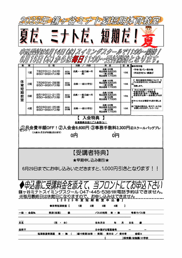 鎌ケ谷ミナトスイミングスクールでは2023年短期水泳教室を7月22日より開催いたします。3歳から小学生までを対象としています。この機会にぜひ泳力アップを目指しましょう。当クラブの会員ではない一般の方にが受講後に通常スクールへ入会すると入会金無料・登録費無料・スクールキャップもプレゼントいたしますぜひお誘いあわせのうえお申し込みください。スタッフ一同心よりお待ちいたしております。
